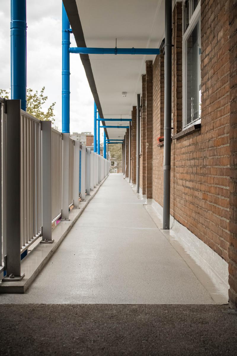 In Nieuwegein zijn de galerijen van zes flats gerenoveerd door Grandia Betonherstel BV uit Asperen. “Voor dit project werkten wij met het vloersysteem Quartzline Protect Fast Cure. Polyaspartic wordt in de zandlaag en toplaag gebruikt. Dit hecht goed op verschillende ondergronden, het is goed antislip te maken, fijn verwerkbaar en het is geurloos. Een pluspunt van Quartzline want onderschat dit laatste niet. Vele producten stinken gewoonweg en dat is uiterst onprettig om mee te werken, niet alleen voor ons maar ook voor de omgeving,” zo vertelt Ludwig Grandia. Het karwei omvatte zo’n 2000 m2. Eerst werden de toplagen verwijderd en de diktekanten en schopranden hersteld en gecoat. Na de renovatie van de vloeren werd nog een antislip-coating aangebracht.