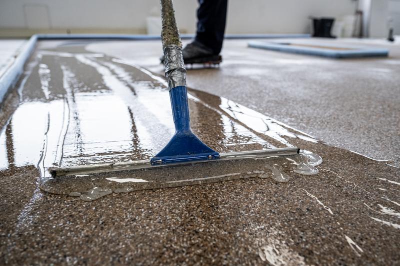 Na het egaliseren is de vloer overlaagd met Quartzline Protect SL-EP2K. Dit is een naadloos heavy-duty vloersysteem voor industriële toepassingen met optioneel een holle plint afwerking. Dit gegoten vloersysteem heeft een sterke chemische protectie en slijtvastheid. De slijtvastheid is verder te versterken met extra instrooimateriaal bestaande uit een zwarte en witte spikkel (carborundum en molochite), wat tevens een mooie glinstering in de vloer brengt.