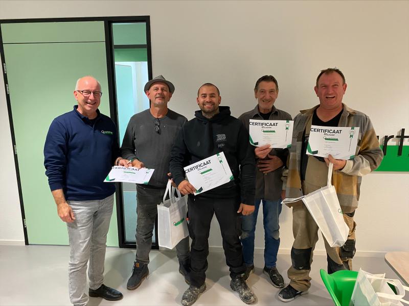 De laatst gehouden producttraining micro-cement bij Quartzline is met goed gevolg afgerond door Jaimy Bloemhard Bouw, Wim van AVGB Onderhoud, Reyer van R. Dijker Totaalonderhoud en Roy en Joris van RDL Vloerverwarming.